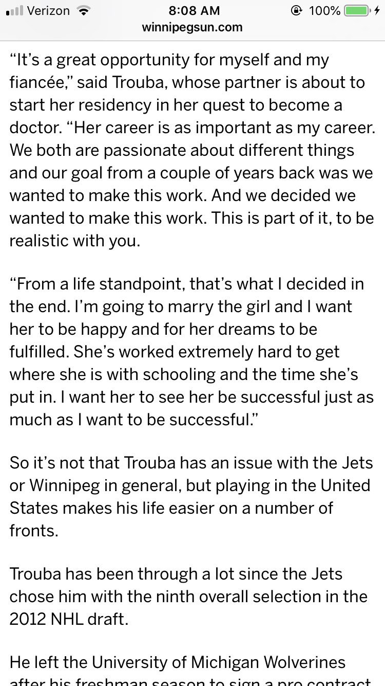 Given Trouba's history in Winnipeg, I'm not sure I buy his statement 100%. I'm sure his fiancee does have the opportunity in NYC as he says, but I wonder if that was just a happy coincidence for him. It's certainly a better thing to get to say than "I don't want to play in Canada".