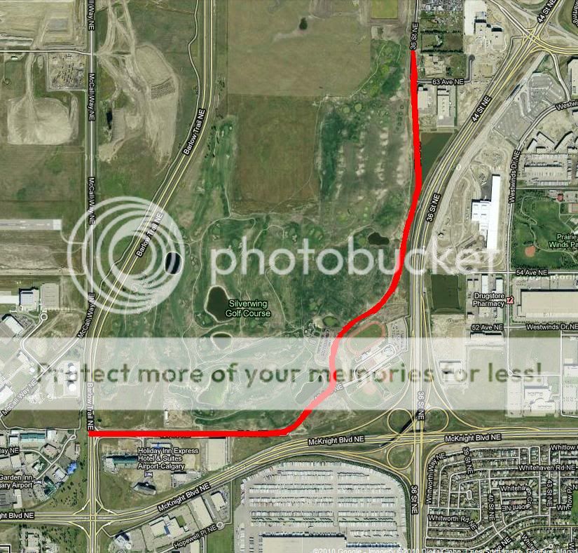 - McCall Way is currently being being re-aligned to converge with the (new) end of Barlow Trail at a new traffic circle just north of McKnight Blvd. There will still be no terminal access, just to the airport services area south of the terminal. Should all be done by the April 3rd Barlow closing, or have a delayed opening not long after that.