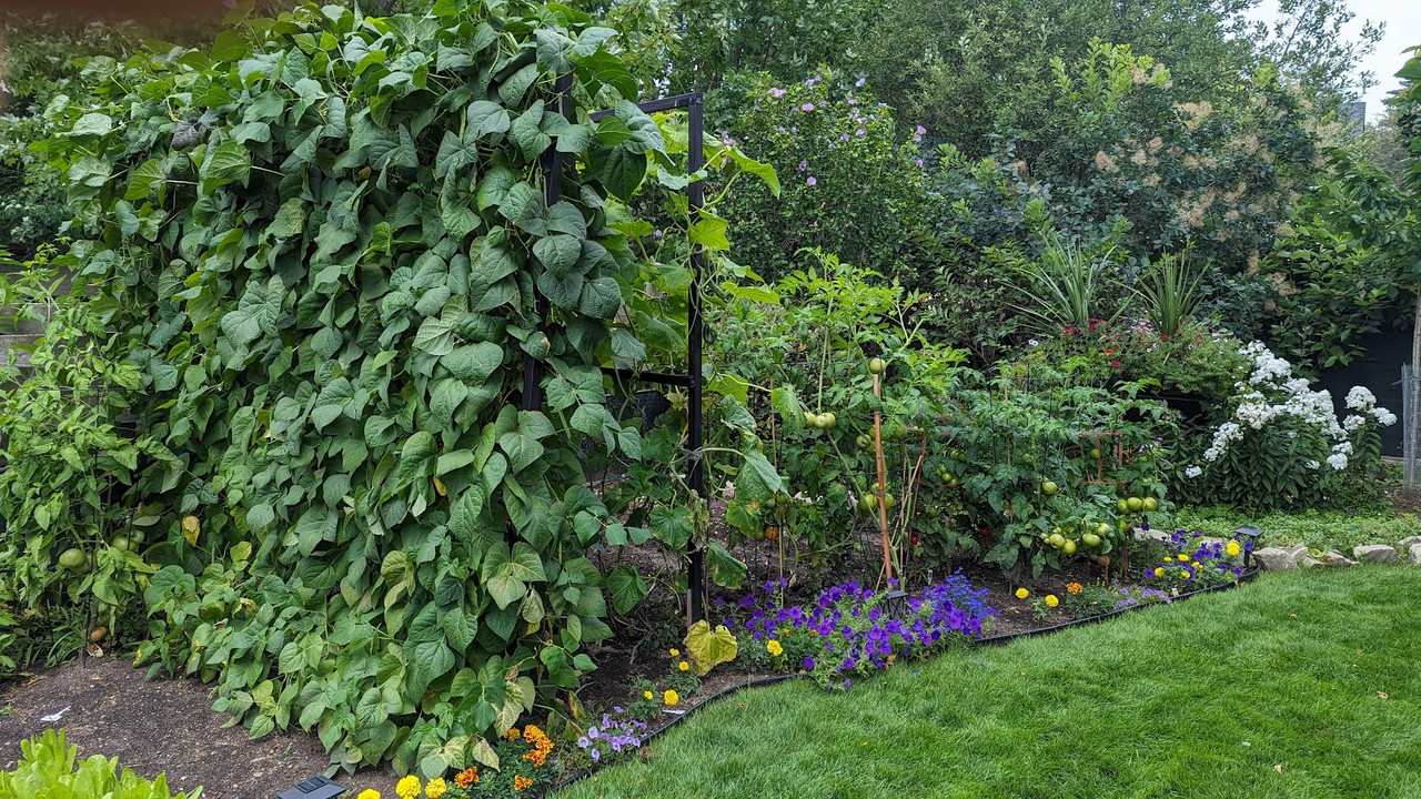 I grow my beans, cukes, peas and some tomatoes vertically.