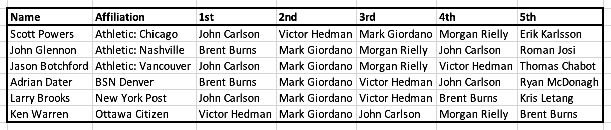 Scott Powers woof! Carlson first is bad in itself but he actually thought Karlsson was better than Burns last year which is like saying Brodie was better than Gio for the Flames. This guy should have his voting privileges revoked.
