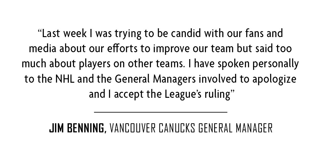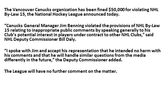 #NHL announces hefty $50,000 fine for #Canucks GM Jim Benning's public comments last week on @TSN1040 about other team's players.
