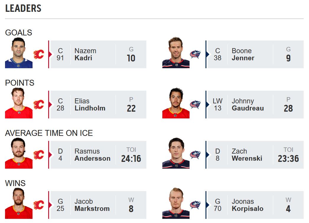 TOP PERFORMERS: Johnny Gaudreau has nine goals and 19 assists for the Blue Jackets. Gustav Nyquist has scored four goals and added three assists over the past 10 games. Toffoli has eight goals and 10 assists for the Flames. Adam Ruzicka has four goals and six assists over the last 10 games.