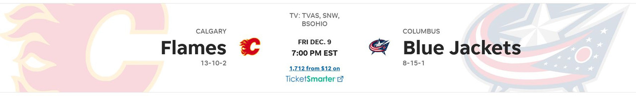 Calgary Flames at Columbus Blue Jackets 5:00pm TV: SNW, TVAS, BSOHIO - RADIO SN960